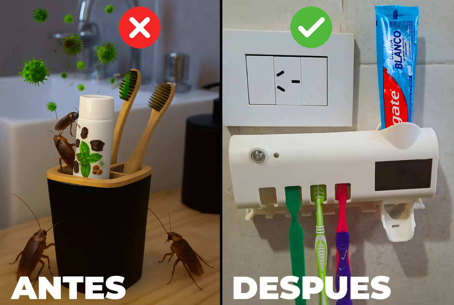 ¿Sabías que los cepillos de dientes, al estar expuestos en el baño, acumulan gérmenes, bacterias y microorganismos invisibles del ambiente? La humedad constante, el aire del inodoro y hasta pequeños insectos que merodean por restos orgánicos pueden contaminar las cerdas.